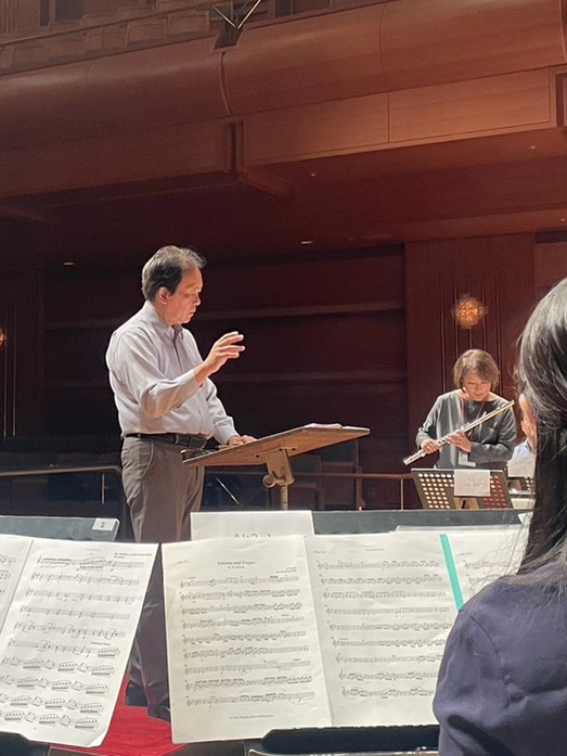 このコンサートでは総勢70名ものフルートオーケストラがアカリ氏と共演しました。お弟子さん中心のフルートオケということで当初私は後ろの方でコッソリ参加するつもりだったのですが、まさかの大役を仰せつかることに(!)アカリ氏との長年のお付き合いで信頼をいただけたのだとしたらとても光栄なことなのですがとにかくおっちょこちょいの私、なかなかにプレッシャーでした(汗)アカリ氏と周りのメンバーの皆さまに支えられなんとか無事に終演し、ホッとしております。