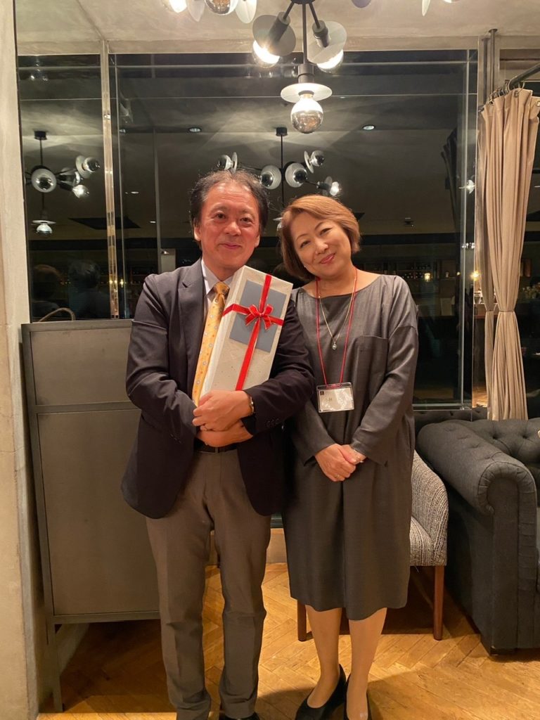 レセプションではアカリ氏に出会いのきっかけをいただき、今年無事に銀婚式を迎えた私たち夫婦から、何か赤い物をプレゼントということで赤ワインを。大喜びしてもらえました。