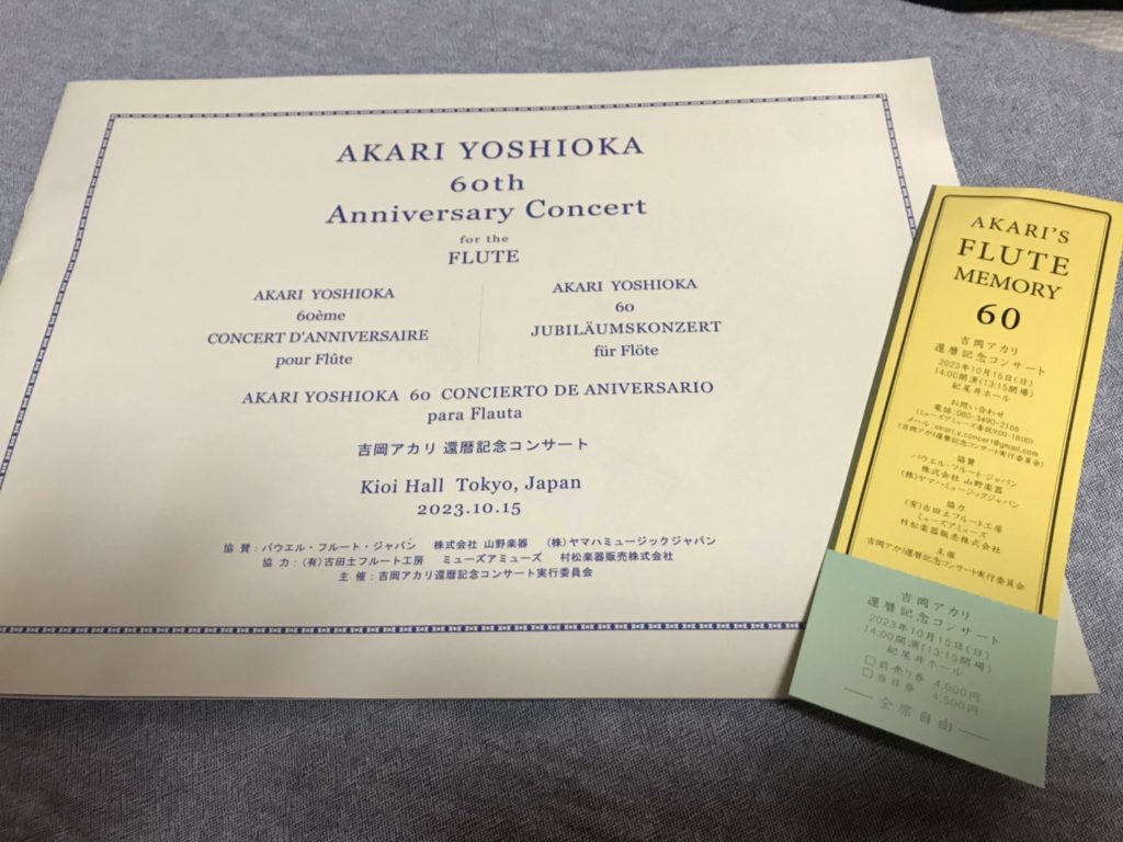 そしてこのコンサートのもう一つの話題がパンフレット。フルート吹きなら誰もが知る「タファネル&ゴーベール」のデザインにソックリ。その表紙をめくるとタファネルの写真に似せたアカリ氏の写真が!これはもう腹筋崩壊の大爆笑でした。実はこれには伏線があり、演奏会のフライヤーはモイーズ大先生の「ソノリテについて」チケットは教則本のアルテのデザイン。アカリ氏の茶目っ気とサービス精神がそのこだわりに顕われていて永久保存したくなります(笑)