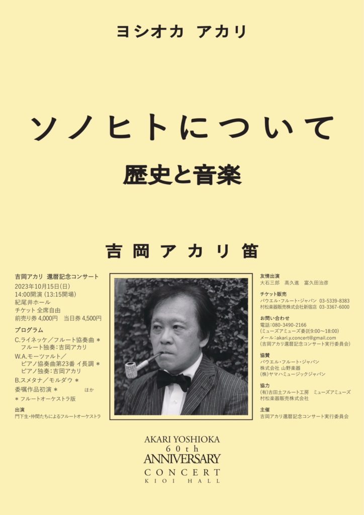 実はこの方、私のフルート人生における大恩人。この方がいなかったら、私は今フルートを吹いていたかどうかわかりません。フルートコンチェルトにピアノコンチェルト(!)アンサンブルに指揮まで、アカリ氏大活躍のコンサート、本番は10月15日(日)紀尾井ホールにて。ぜひお運びいただきたくご案内申し上げます。
